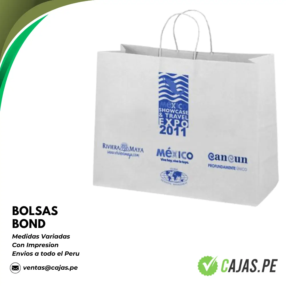 En Cajas.pe fabricamos bolsas bond personalizadas resistentes para tu negocio. Son de un papel son una alternativa ecológica y elegante frente a las bolsas plásticas, ideales para tiendas, boutiques, panaderías, librerías, farmacias y todo tipo de comercios.