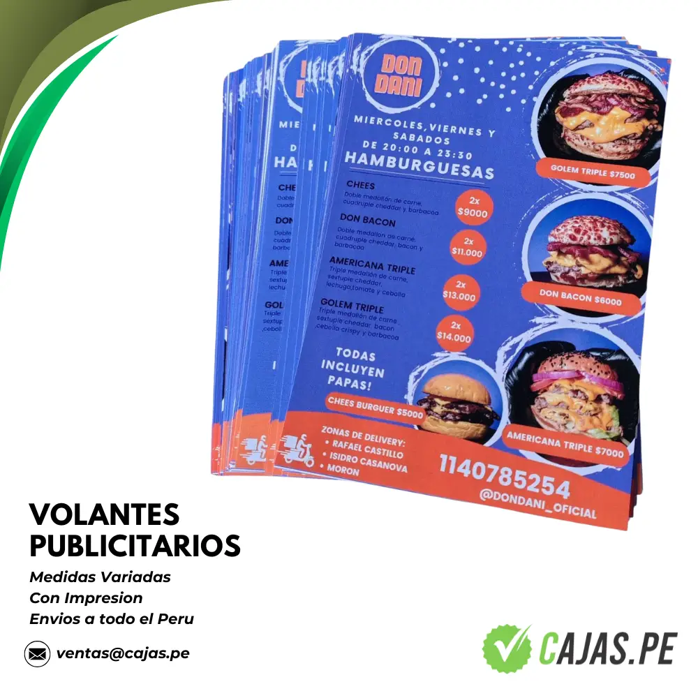 En Cajas.pe nos especializamos en la impresión de volantes publicitarios, para promocionales y decoraciones en distintos tamaños y acabados. Imprimimos en alta resolución sobre papel couché de alta calidad, ideales para campañas, eventos, ferias, negocios y más. Ideales para acompañar tu